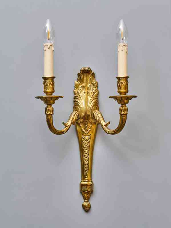Starožitná nástěnná lampa / aplika z lité mosazi v klasicistním stylu s florálním zdobením. Robustní tělo s velkým akantovým listem, z kterého vycházejí dvě prohnutá ramena nesoucí objímky s žárovkami. Na první pohled zaujme kvalitní provedení ve zlaté barvě s jemnými detaily. Lampa je plně funkční a ihned k užívání. Lampa je na dvě žárovky s klasickým svíčkovým závitem E14 do 40W - vhodné jsou normální, halogenové i lede žárovky do 40W, které nejsou součástí, ale můžeme dodat nebo doporučit nejlepší volbu pro váš projekt.