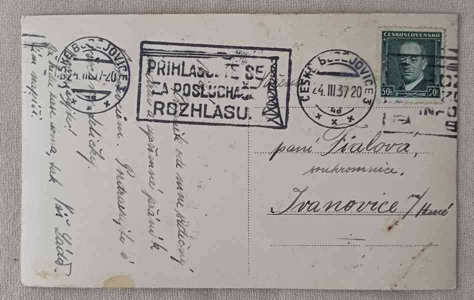 Prodám černobílou pohlednici Českých Budějovic z roku 1937, kde je na reversu příležitostné razítko Československé pošty s textem: "Přihlašujte se za posluchače rozhlasu" Svědčí to o reklamě, kterou si rozhlas zaplatil, aby se mu zvedl počet posluchačů, platících komcesionářský poplatek. Cena za pohlednici s razítkem - 100,- Kč. Osobní předání na Praze 3, nebo odeslání přes Balíkovnu či Zásilkovnu. Volejte 770 630 523, nebo pište na morgiana007@gmail.com