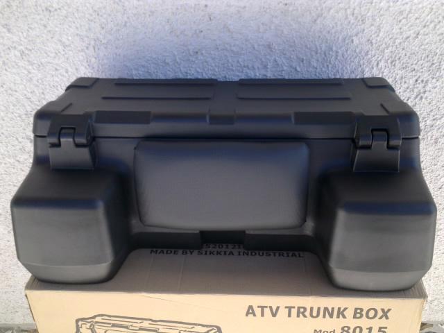 Maxikufr určený pro čtyřkolky (quad, ATV, Sikkia) o objemu 150 litrů (nikdy nepoužitý, originálně zabalený) vestavěné opěradlo uzamykatelný (2× klíč) dostatek úložného prostoru kovové zámky voděvzdorný rychlá a snadná montáž kvalitní nárazuodolný vysokohustotní polyetylen LLDPE těsnění proti vnikání vody pohodlná čalouněná opěrka zad zesílené dno zásobníku dvě zadní odrazky šířka 90 cm.