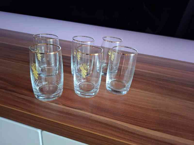 Prodám sklenky se zesíleným dnem, se zlatým okrajem, s obrázkem hroznového vína.