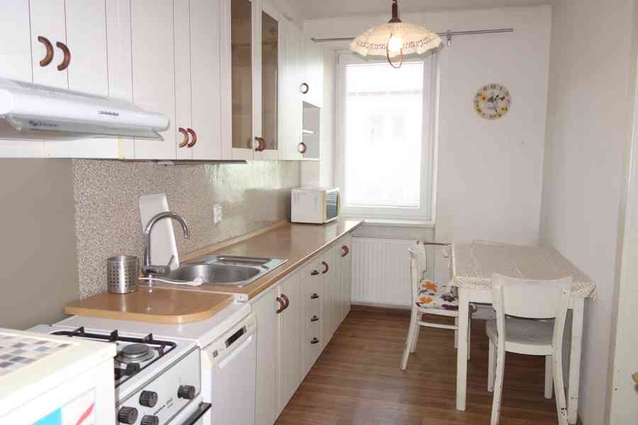 Byt je vybaven kuchyňskou linkou, plynovým sporákem s digestoří, myčkou, ledničkou a mikrovlnnou troubou. Vytápění je ústřední plynovým kotlem a ohřev vody zajišťuje elektrický bojler. V bytě je zaveden internet. Po dohodě s pronajímatelem lze stávající nábytek vyklidit.