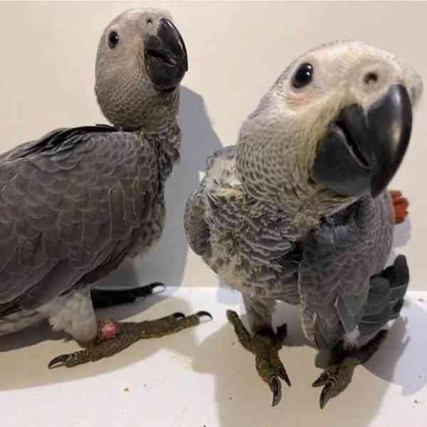 Dokončení a domestikovaní papoušci africké šedé. Jsou velmi inteligentní, chytří a hraví. Je jim dvanáct týdnů. Jsou očkovaní a odčervení. Mají veškeré doklady EU a jsou bezcelní. Zájemci o zvířata by nás měli kontaktovat pro více informací.