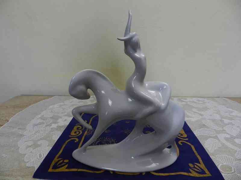 Hezká porcelánová plastika, Dívka na koni - Jitro, styl Brusel - Royal Dux, Jaroslav Ježek, 2 pol. 20 stol.