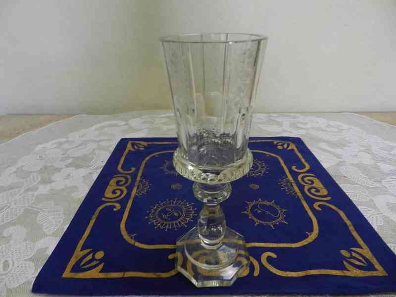 Krásný starý broušený Pohár, masivní čiré sklo, ornamenty, Čechy.