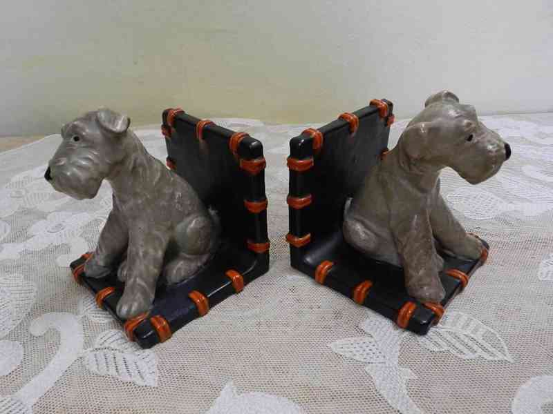 Stylové figurální zarážky na knihy se psy, glazovaná malovaná terakota, velmi kvalitní zpracování - Značeno + původní štítek prodejce, Ant. Mayer Keramik Rakousko, 1 třetina 20stol.