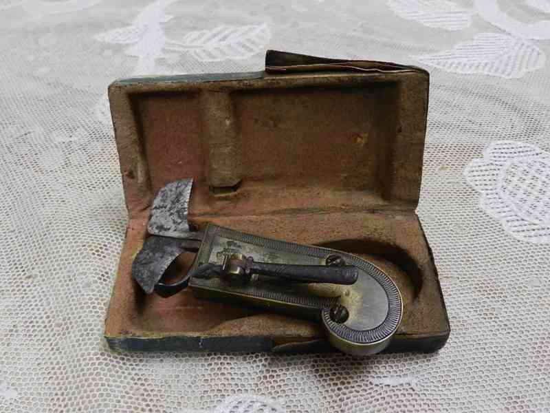 Velmi starý kovový Přístroj na pouštění žilou včetně krabičky, kompletní stav, Značeno, M. Fischer, konec 18 stol až počátek 19 stol.
