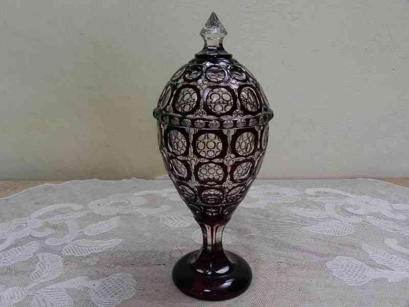 Luxusní rubínová Dóza či Pohár s poklopem, optický dekor, přejímané sklo, brus - Nový Bor, 1 čtvrtina 20 stol.
