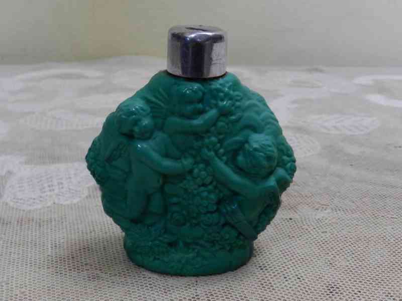 Hezký Art Deco flakon s Anděly, plastický relief, malachitové sklo - Schlevogt, kolem 1 třetiny 20 stol.