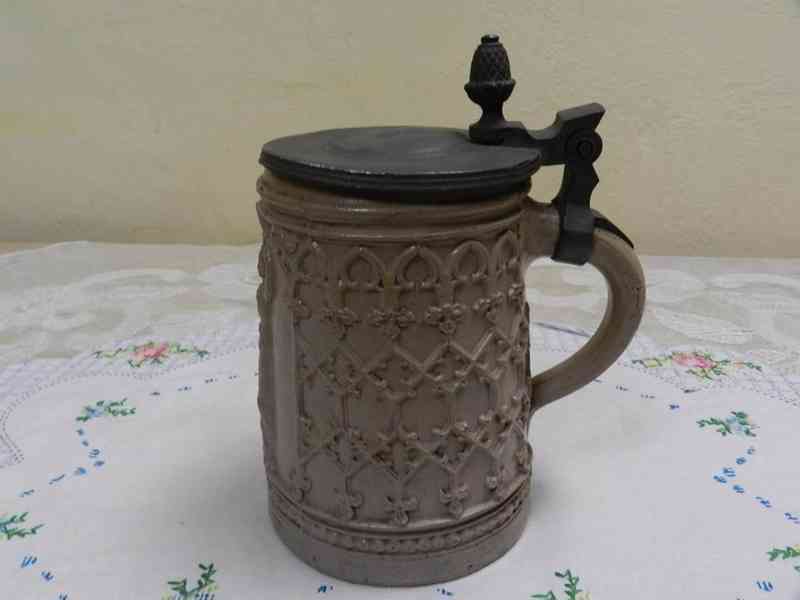 Krásný velmi starý keramický Korbel s poklopem, Mnichov.