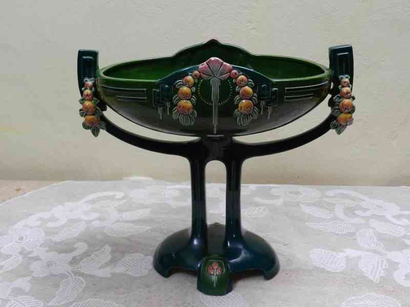 Krásný secesní keramický malovaný Nástolec, Majolika - Dubí, značeno Eichwald.