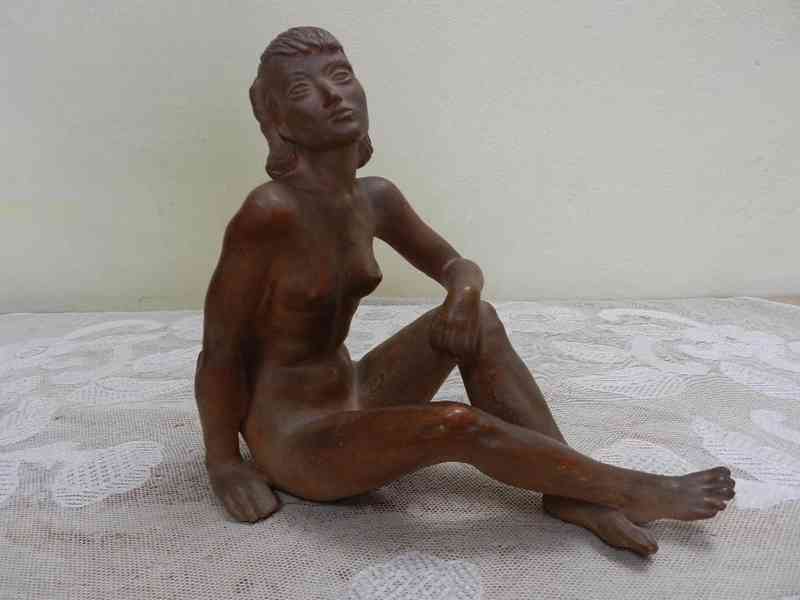 Krásná keramická plastika, Sedící Dívka,, Monika,, velmi kvalitní zpracování - signováno, Julius Lankáš pro Družstevní Práci, 30 léta 20 stol.