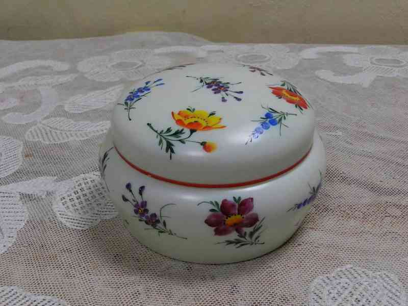 Krásná velmi stará ručně malovaná Dóza s různými motivy květin, mléčné sklo.