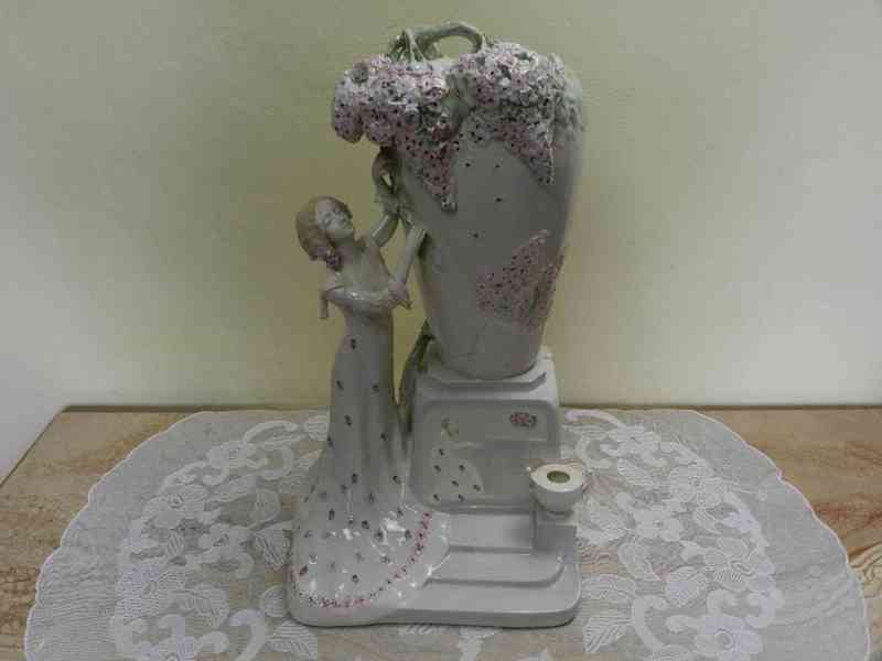 Krásná obří secesní keramická Plastika, Dívka s květinami a Klavírem - Značeno JM, patrně Johann Maresch, datováno 1907, Signováno na soklu.