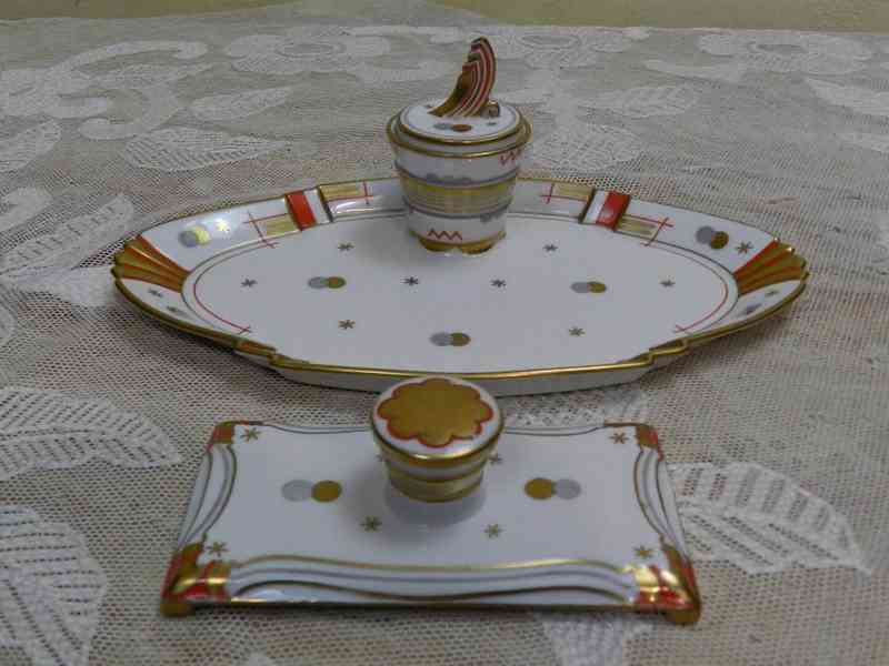 Luxusní Art Deco porcelánový Kalamář, bohaté zlacení, ruční malba - Horní Slavkov, jubilejní značka 1932.