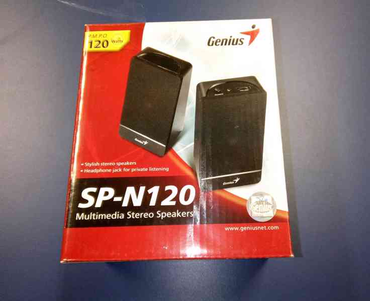 Prodám nepoužité (nikdy nevybalené) malé aktivní reproduktory Genius SP-N120, v černém elegantním provedení, frekvenční rozsah 90Hz až 20kHz, odstup signál/šum 80dB, výstup na sluchátka. Rozměry satelitů jsou 75 x 150 x 53 mm.