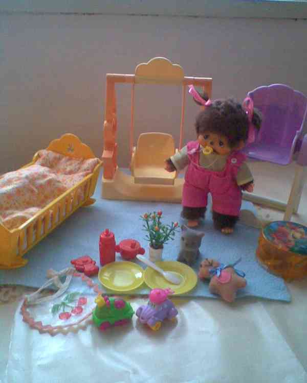 větší sada na hraní nehraná Mončičáček, dvě panenky, spoustu doplnků, ale i nábyteček krmící židličku, houpačku, kolébku, vanu a wc, přenosku, kočárek, možno koupit bez kočárku ručně dělaný z retro kočárku a cena bez něj 4200,-