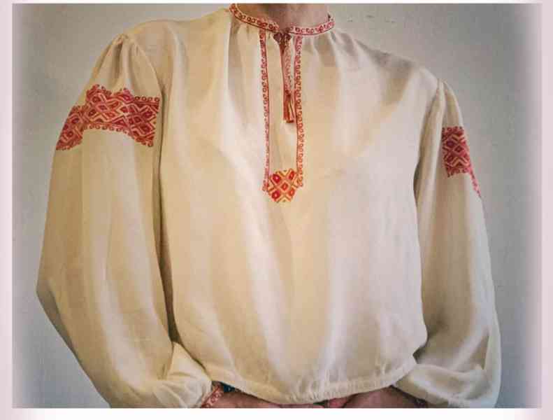 Nabízím krásnou vintage vyšívanou košili – ruční práce, původ z Ukrajiny. Vyšívaná jemným křížkem v tradičních barvách: červená (síla, ochrana, energie) a žlutá (slunce, úroda, život).