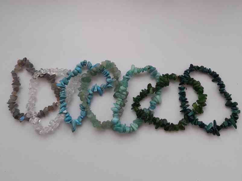 Prodám náramky ze sekaných minerálů: labradorit, křišťál, tyrkys, avanturín, amazonit, chromdiopsid (ruský smaragd) a malachit. Náramky byly nošené a jsou očištěny vodou. Cena za všechny náramky