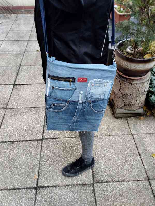 Rozměr 35 x 37 cm. Odšité dno 7 cm. Délka popruhu až 170 cm. Uvnitř bavlněná podšívka. Na jedné straně jedna větší kapsa, na druhé straně dvě menší kapsy.