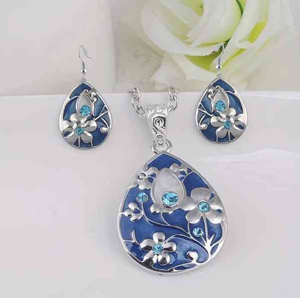 Tato vyjímečná sada šperků v sobě spojuje jemnost květinových linií a hloubku barev, které okamžitě přitahují pozornost. Teardrop tvar přívěsku i náušnic vytváří harmonickou siluetu, zatímco stříbrné květinové ornamenty a třpytivé kamínky dodávají celku luxusní, ženský a nadčasový charakter. Každý kus je navržen tak, aby podtrhl osobitý styl a přirozenou krásu nositelky. Perfektní pro slavnostní příležitosti, ale i jako stylový doplněk pro běžné dny. Ideální dárek pro ženu, která miluje krásu, jemnost a šperky s duší.