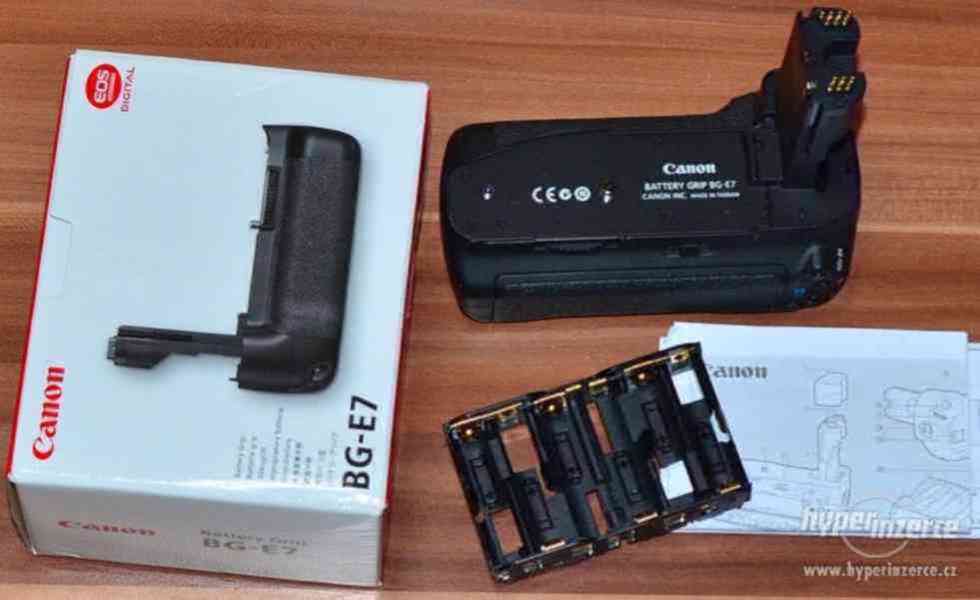 Součástí aukce je: grip Canon BG-E7, Držák na 6 AA baterií v originál krabici.