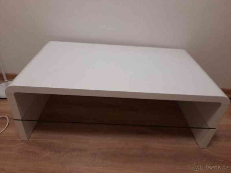 Používaný, rozměry 110x60 cm, výška 40 cm. Skleněná polička ve výšce 17 cm. Má drobné škrábance od používání, barevné skvrny.