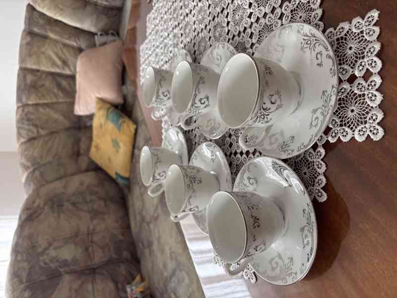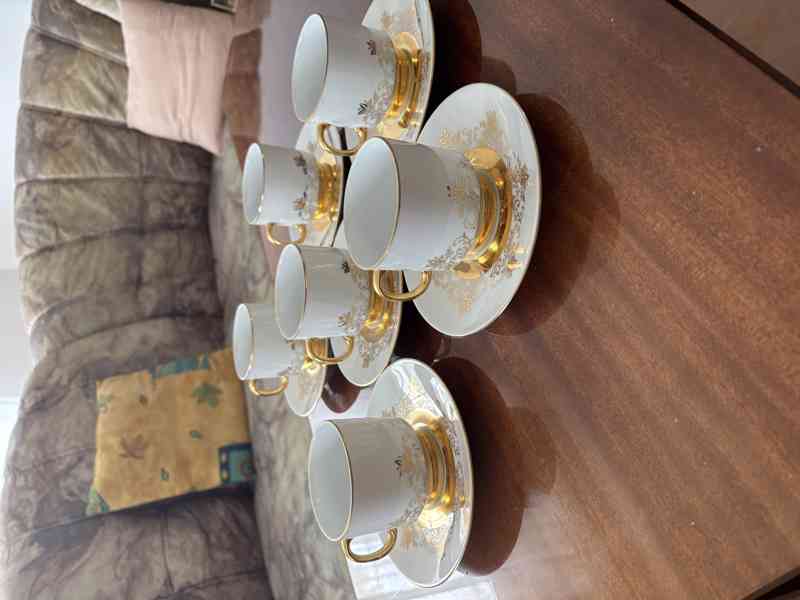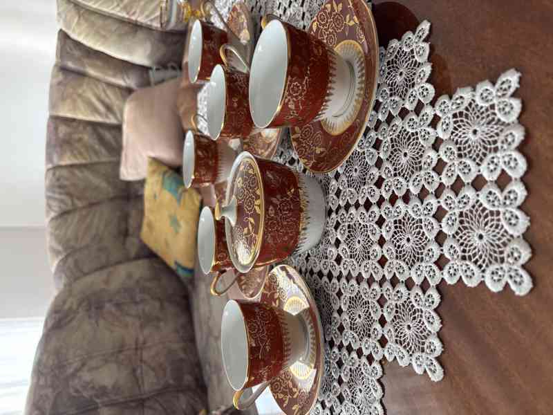 Prodám čajovou nebo kávovou soupravu 6 šálků s podšálky a cukřenkou, hnědo-bílo-zlaté. Výrobce Moritz Zdekauer. Nepoužívané, pouze vystavené. Šálek výška 6cm, průměr 7,5cm, objem 0,9dl, talířek průměr 13,5cm, cukřenka výška 7cm, s pokličkou 10cm.