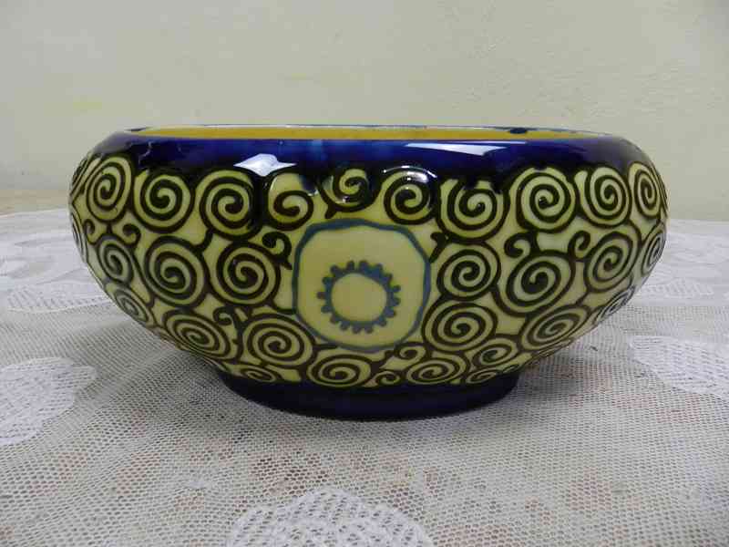 Krásná secesní malovaná keramická Žardiniera, Majolika - Ditmar Urbach.Rozměry: výška 11cm, 24 -14cm, hmotnost cca 700g.