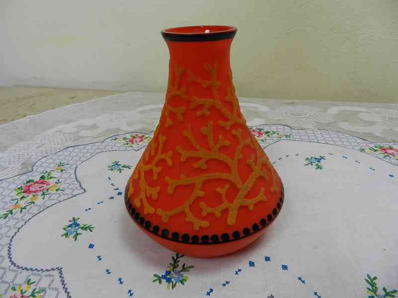 Zajímavá autorská oranžová Váza - Jižní Čechy, počátek. 20 stol.Rozměry: výška 16,5cm, průměr 14cm, hmotnost cca 460g.