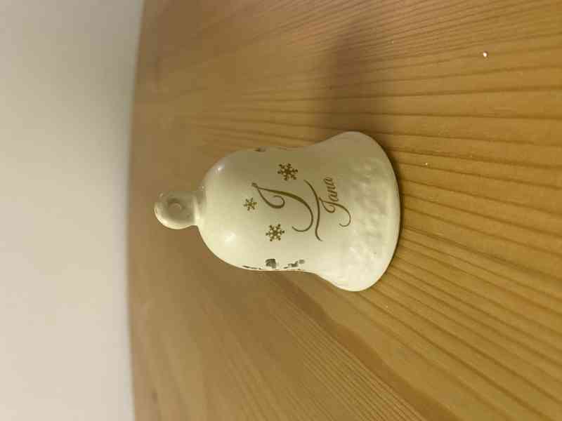 Nabízím krásný porcelánový vánoční zvonek s nápisem „Šťastné a veselé“ a jménem Jana. Zvonek má výřez ve tvaru sněhové vločky a jemné zlaté zdobení. Ideální jako vánoční dekorace nebo osobní dárek.