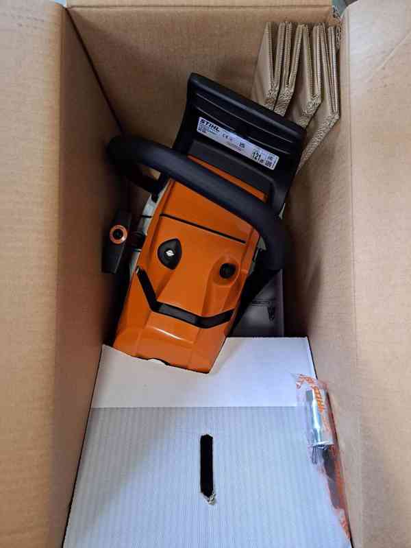 Nová motorová pila STIHL MS500i na prodej. Pila je zcela nová, nikdy nebyla naplněna benzínem ani olejem a byla vybalena pouze kvůli fotografiím.